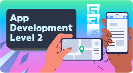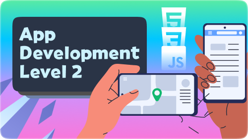 Students use HTML, CSS, and JavaScript to build the interface, style, and functionality of an app.